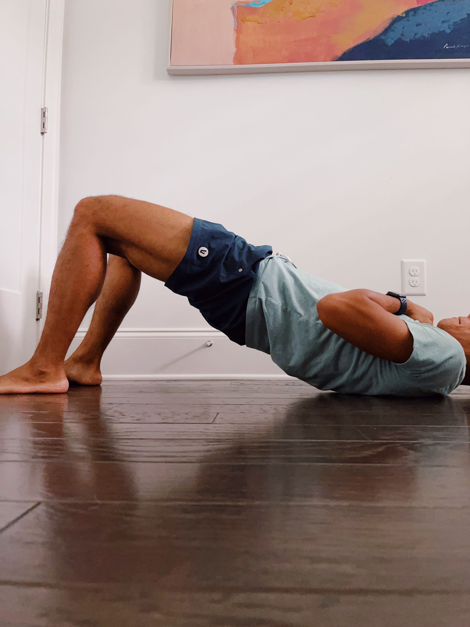 Start with lying on your back with your knees bent. Next bring your butt up towards the sky, squeezing your butt muscles at the top. The single leg option is to make the bridge more difficult. Perform 3 sets of 10 reps