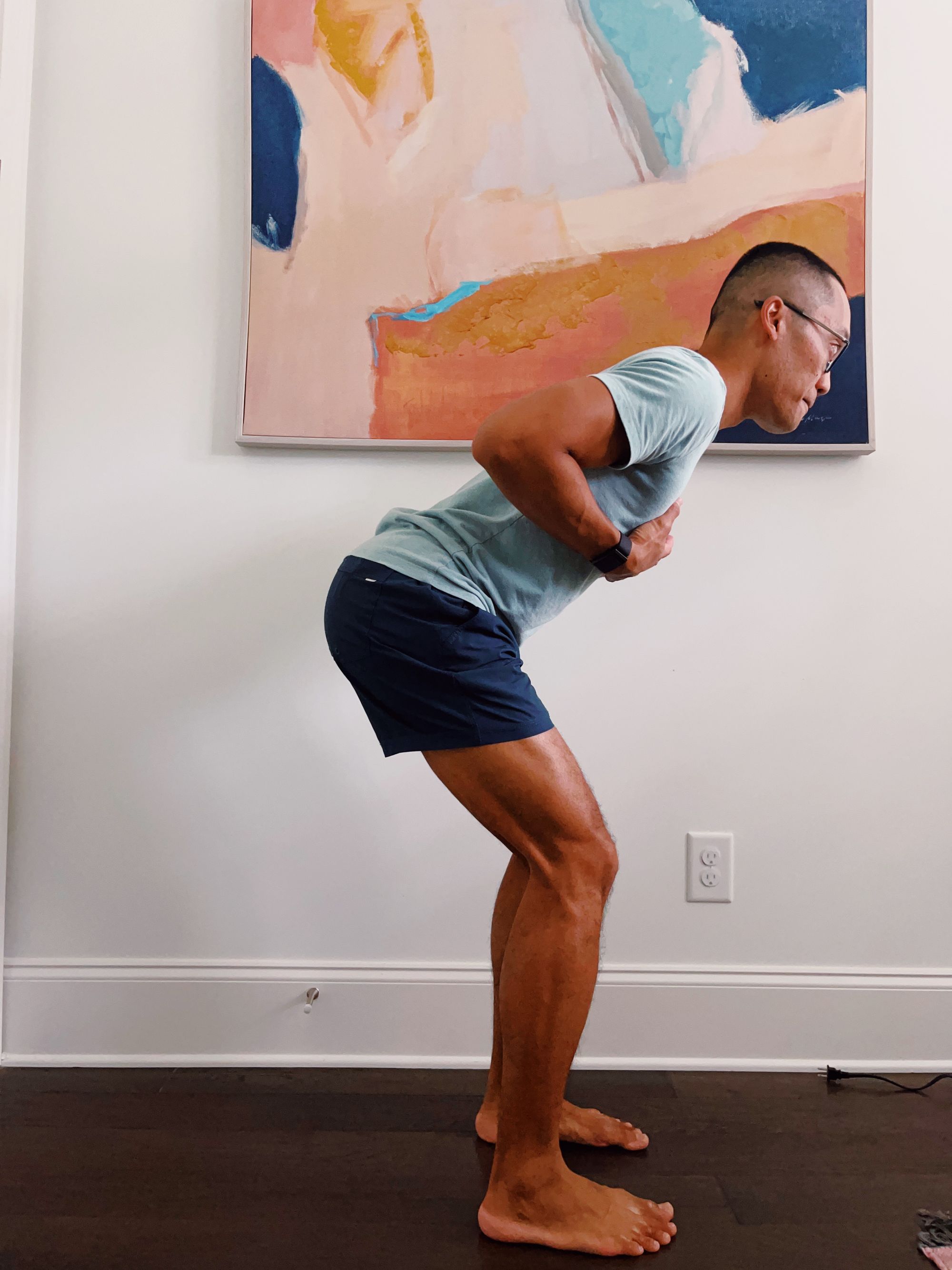 Have your knees slightly bend, then lean your upper body forward. You'll "hinge" at your hips, pushing your butt backwards as far as you can slowly. You'll feel this at your butt and hamstrings. Perform 3 sets of 10 reps.