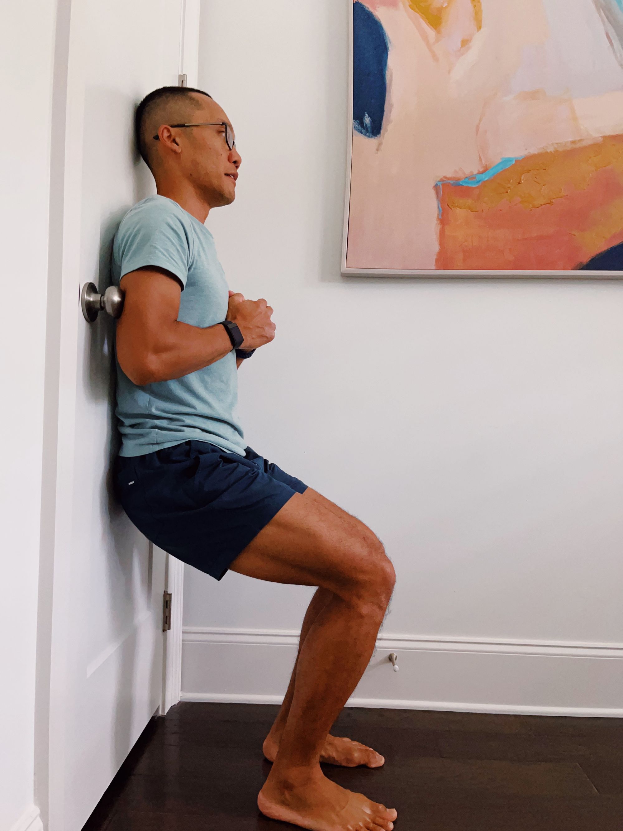 With your back against a wall and feet in front of you, slide down to about 90 degrees bend at the knee. Hold for 30 seconds. Keep constant pressure contact between your forefoot and the floor, yet keep your heels on the ground.