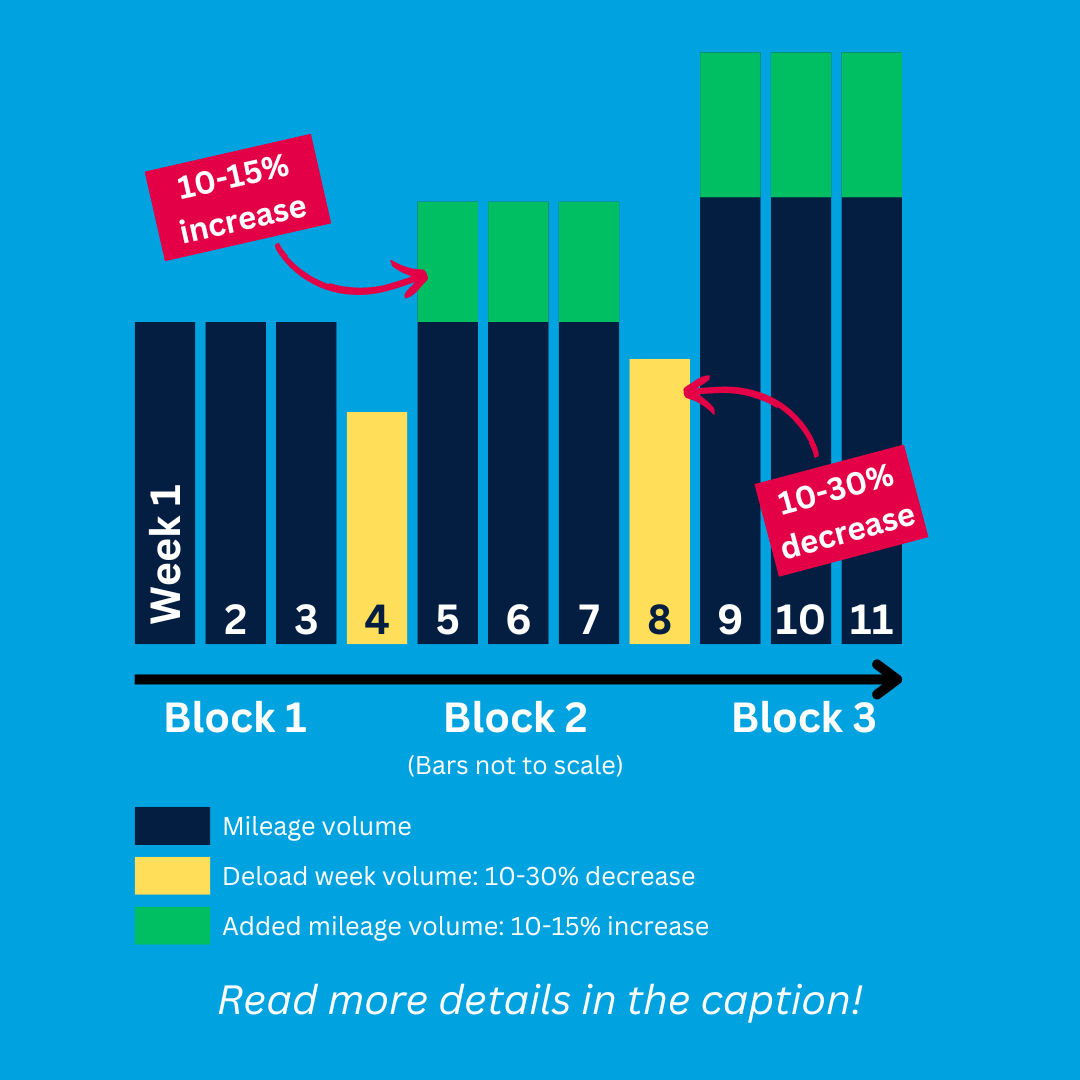 📉 Take a “deload week” after your block. This allows your body to recover and grow the necessary adaptations to take on your next block. The decrease is about 10-30% of previous weekly mileage.